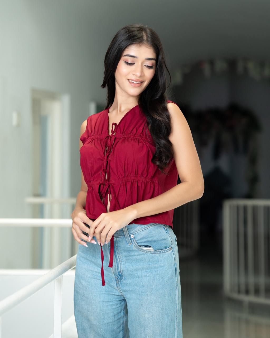 Effortlessly chic and feminine. This maroon sleeveless top features a trendy lace-up front and a flattering cinched peplum waist that creates a beautiful silhouette. Crafted from lightweight, breathable fabric, it’s designed to keep you cool while looking polished