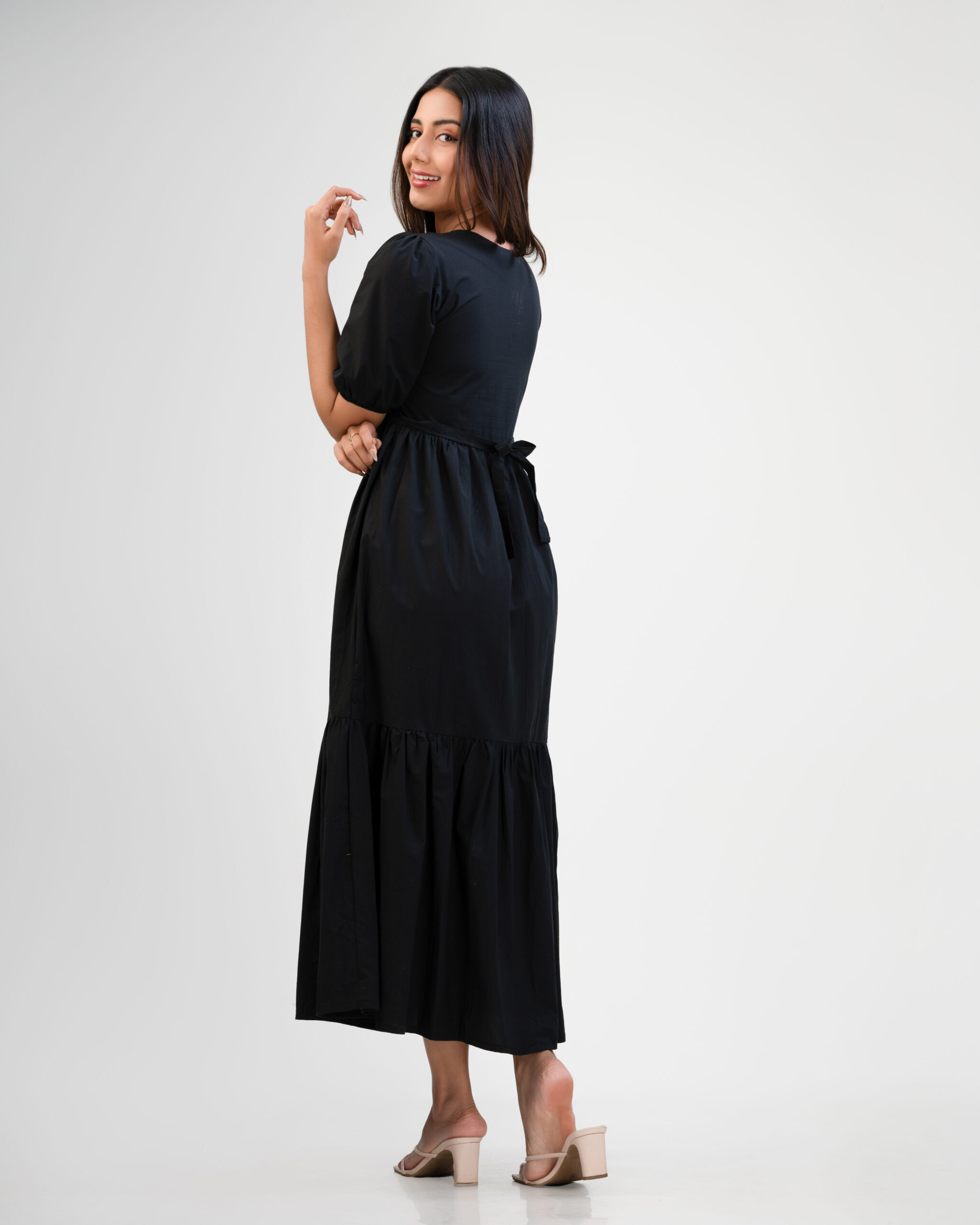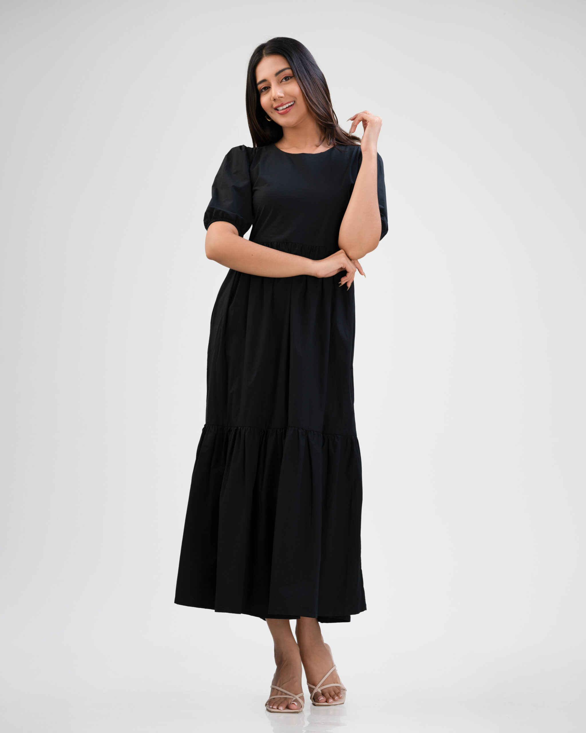 A timeless black cotton maxi dress offering effortless elegance and all-day comfort—perfect for any occasion