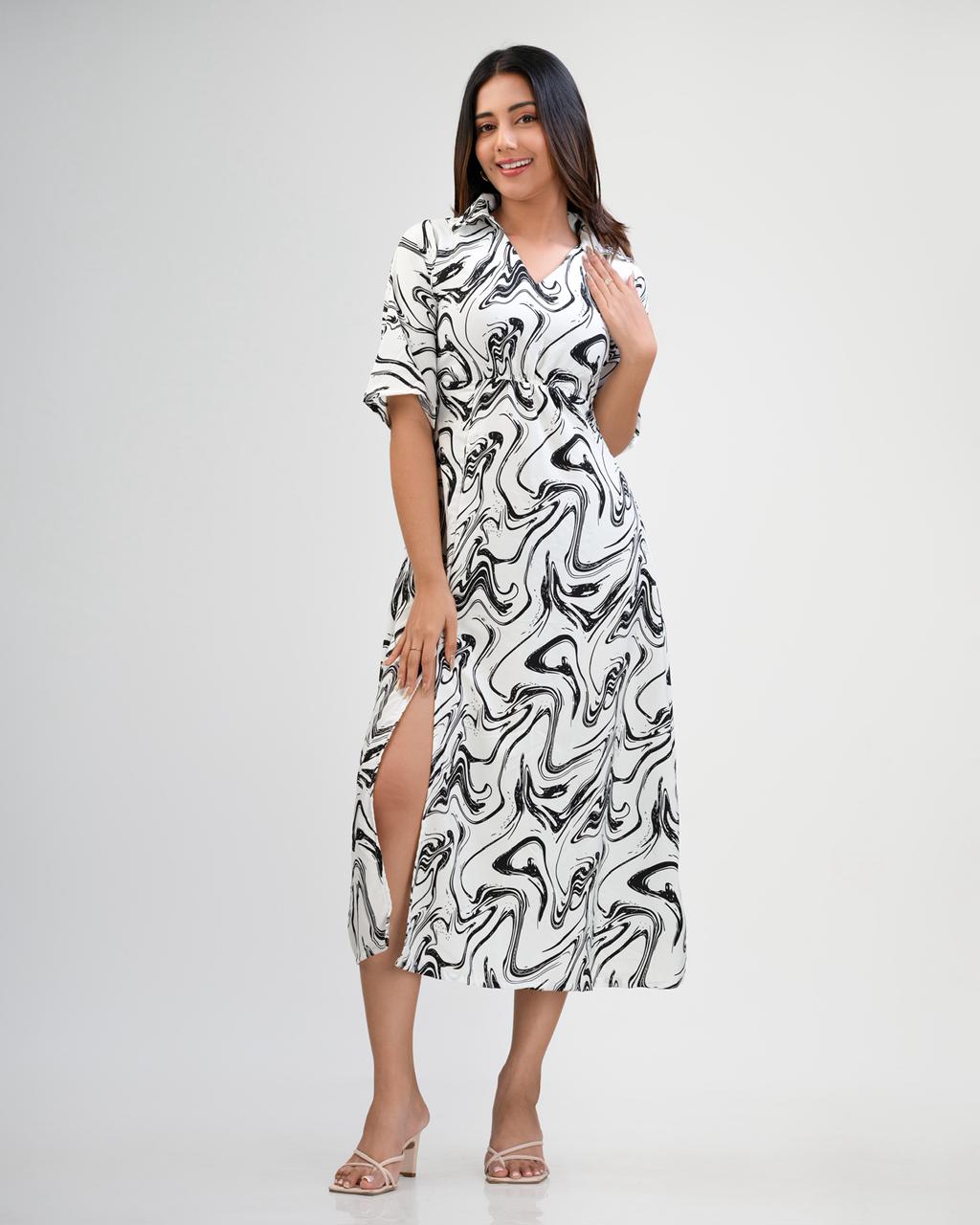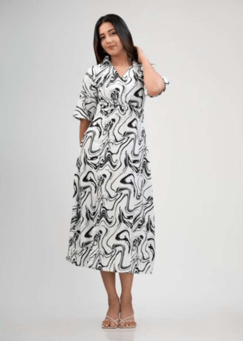 a flowing, elegant long dress in crisp white with eye-catching prints — perfect for breezy summer days or relaxed, chic outings.
